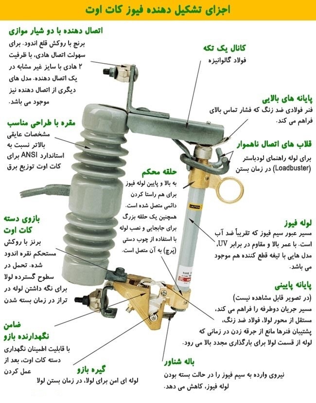 در شبکه فشار متوسط توزیع برق یکی از حفاظت کننده ها فیوز کات اوت است، که توسط قطعه ای که به آن المنت می گوید و داخل یک لوله ای از فیبر نسوز که دو طرف آن طبق شکل تکیه گاه برنجی قرار می گیرد.