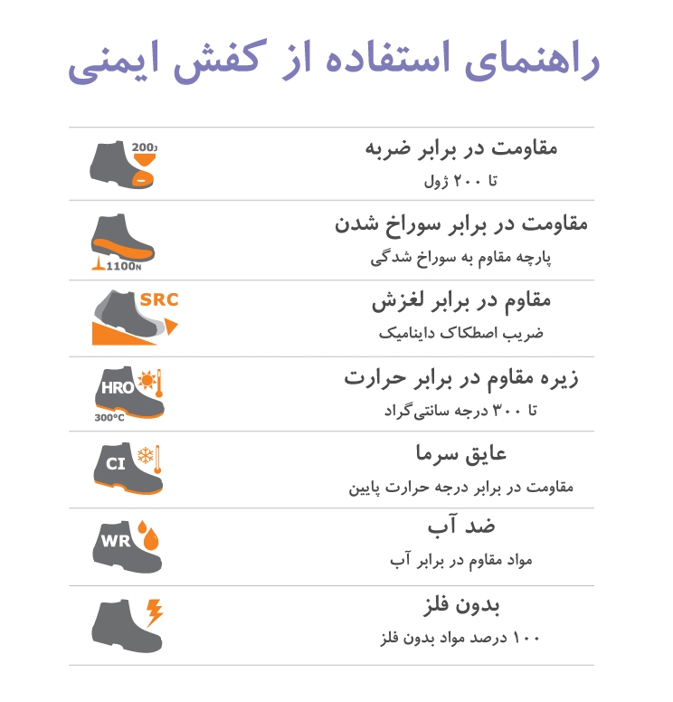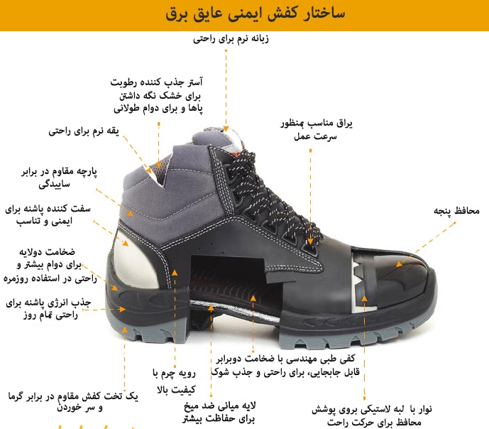 کفش های ایمنی افرادی که با برق سر و کار دارند یا در محل کارشان احتمال ایحاد جرقه وجود دارد، باید فاقد هر نوع قطعات فلزی باشد.