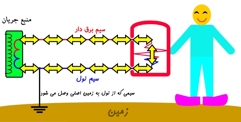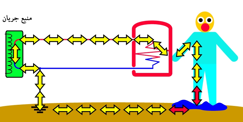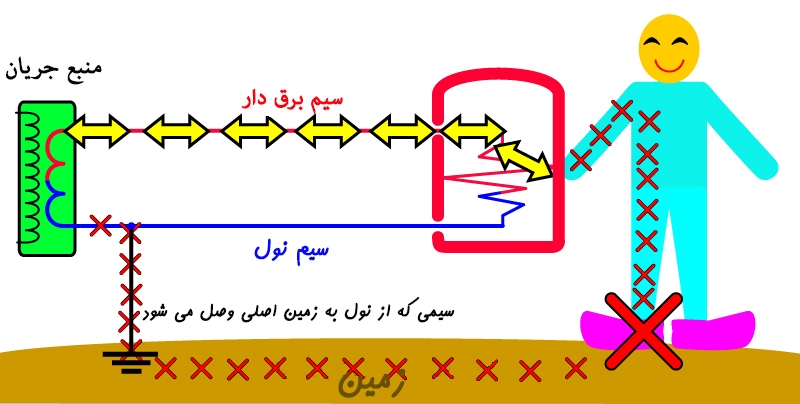 کفش عایق از ایجاد مسیر بازگشت جریان برق جلوگیری می کند (ضربدر قرمز کوچک). در نتیجه شوک بزرگ به شخص وارد نمی شود.